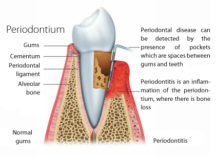 In fact, periodontal disease is a bacterial infection of the periodontium. Microbes in the dental plaque can attack the gums, bone, and can cause the loss of the affected tooth.